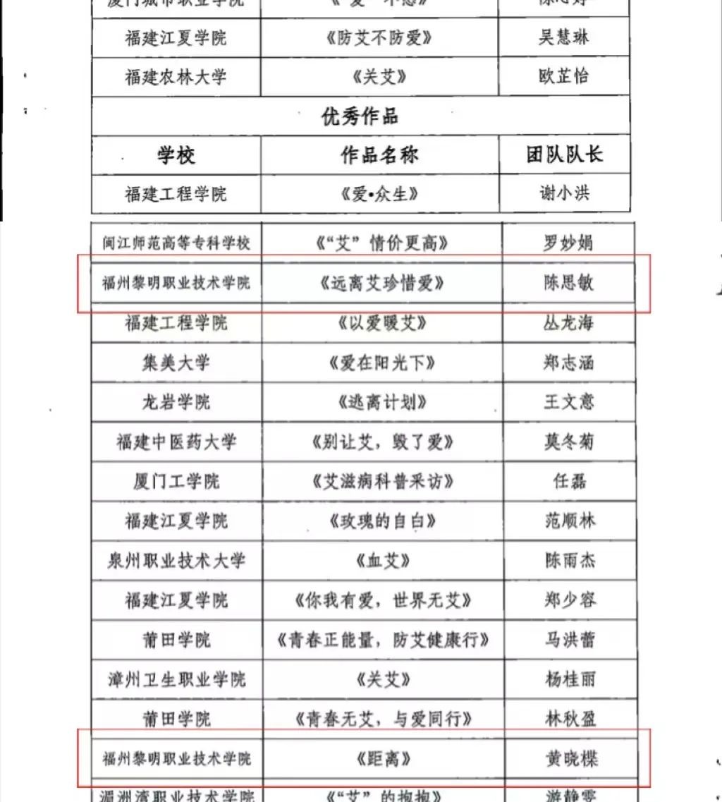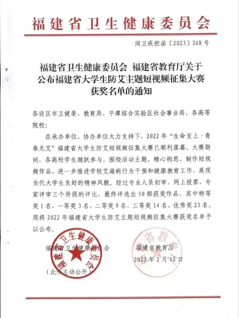 近日,福建省卫生健康委员会、福建省教育厅公布了福建省大学生防艾主题短视频征集大赛获奖名单,我院艺术与建筑系21广告3班宋保富同学的作品《悔》荣获二等奖,经济管理系20会计1班陈思敏同学的作品《远离艾珍惜爱》、艺术与建筑系20广告1班黄晓楪同学的作品《距离》荣获优秀奖。