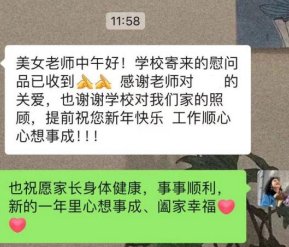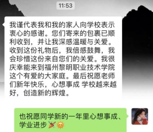 针对偏远地区未能线下走访的经济困难学生,学院“悄悄”为学生们精心准备了“年货大礼包”,将“祝福”邮寄到学生家中,将温暖传递到学生手里。辅导员们通过线上连线的方式向学生及家长传达学校的问候和关怀。学生、家长们们纷纷晒出了收到的“年货大礼包”,与辅导员分享团圆的喜悦,对学院的关心和帮助表达真挚的感谢。