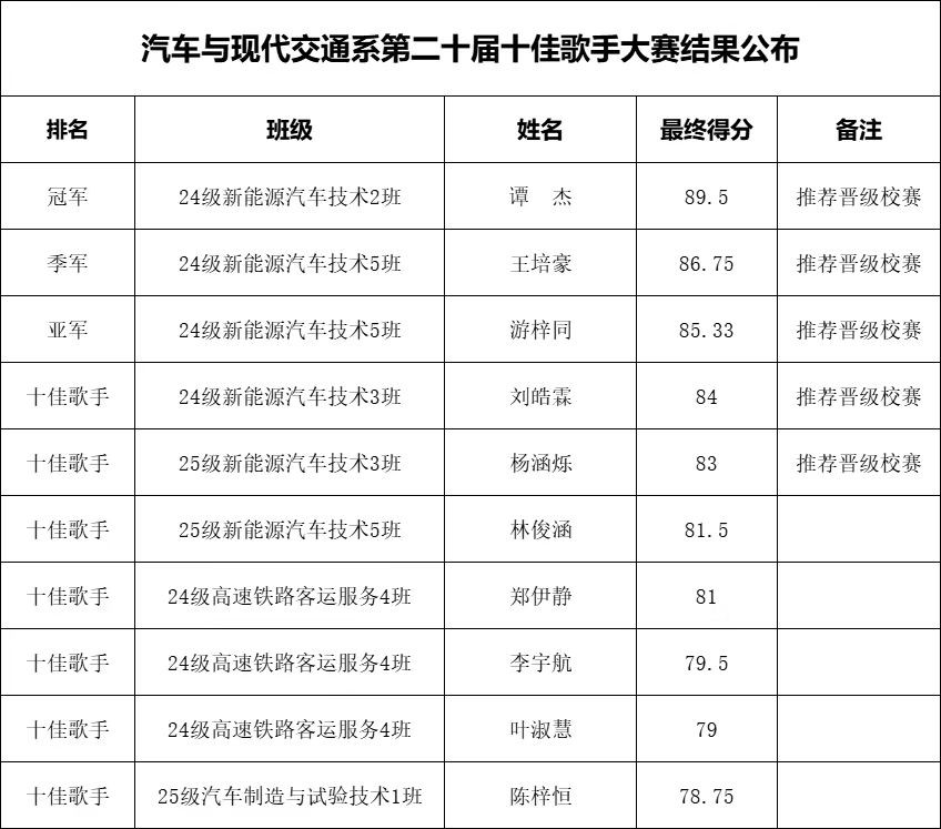 经过评委现场评审,最终评选出系部十佳歌手获奖名单。