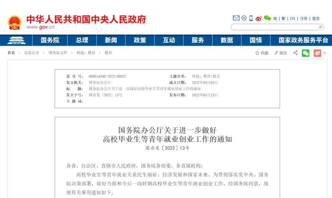 5月13日,国务院办公厅发布《国务院办公厅关于进一步做好高校毕业生等青年就业创业工作的通知》,《通知》提出了一系列重大利好措施,值得关注的是以下几点(通知全文附后):