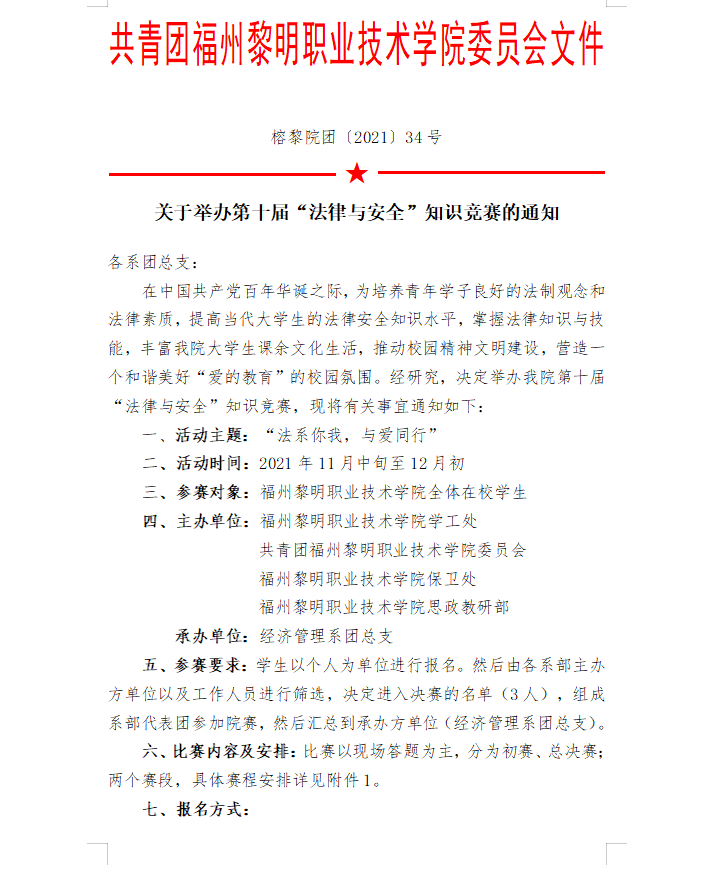 榕黎院团〔2021〕34号——关于举办第十届“法律与安全”知识竞赛的通知