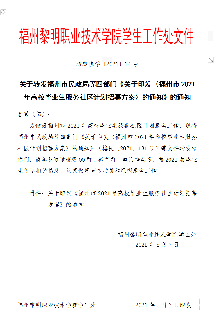 榕黎院学〔2021〕14号——关于转发福州市民政局等四部门《关于印发〈福州市2021年高校毕业生服务社区计划招募方案〉的通知》的通知
