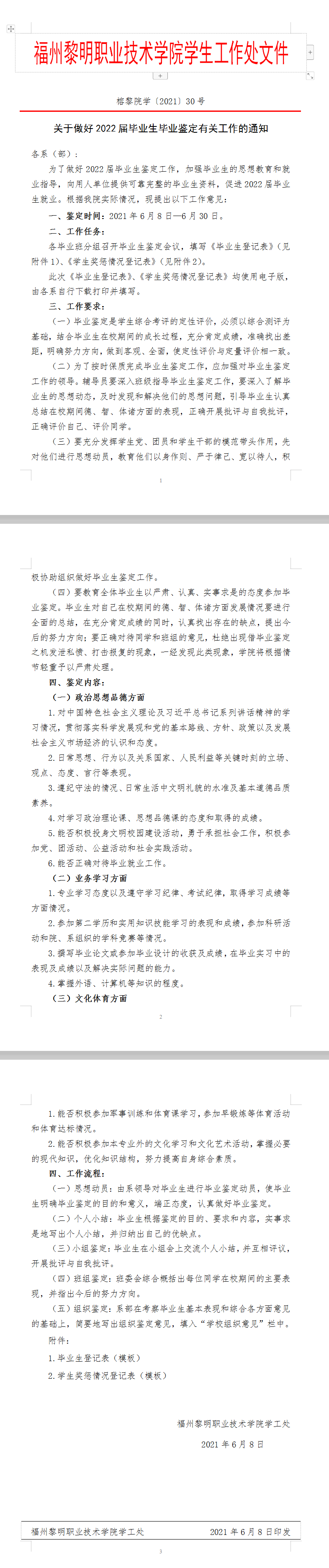 榕黎院学〔2021〕30号——关于做好2022届毕业生毕业鉴定有关工作的通知