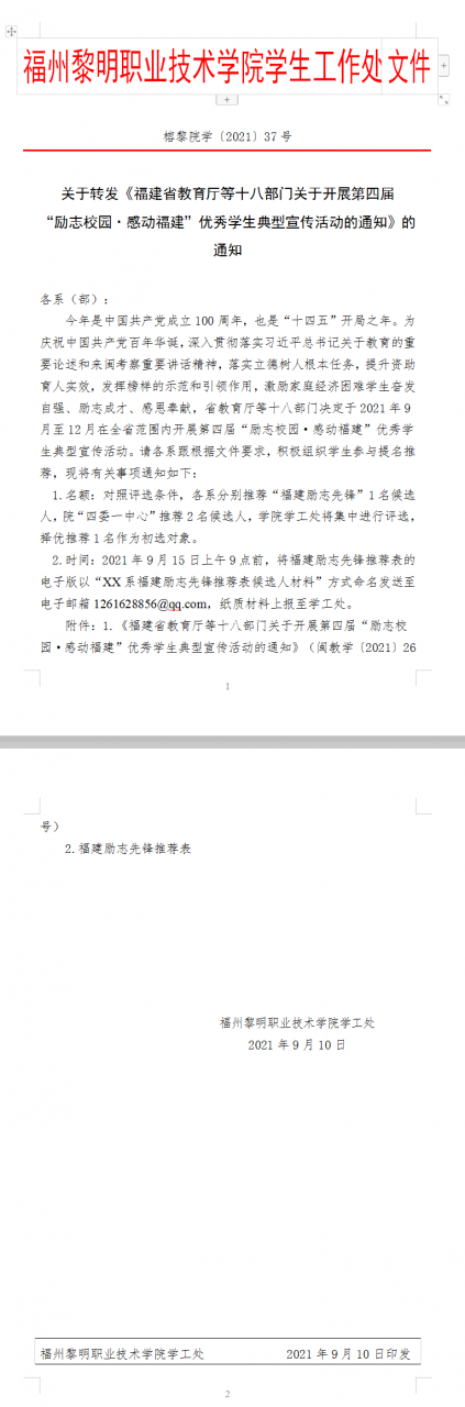 榕黎院学〔2021〕37 号——关于转发《福建省教育厅等十八部门关于开展第四届“励志校园·感动福建”优秀学生典型宣传活动的通知》的通知