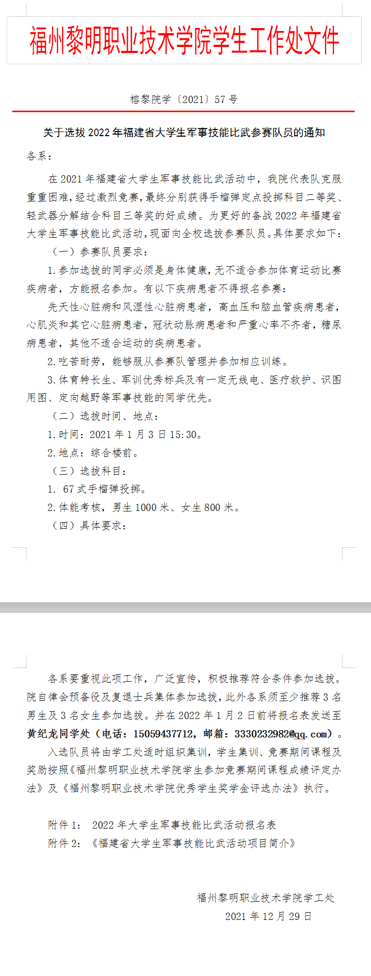 榕黎院学〔2021〕57号——关于选拔2022年福建省大学生军事技能比武参赛队员的通知