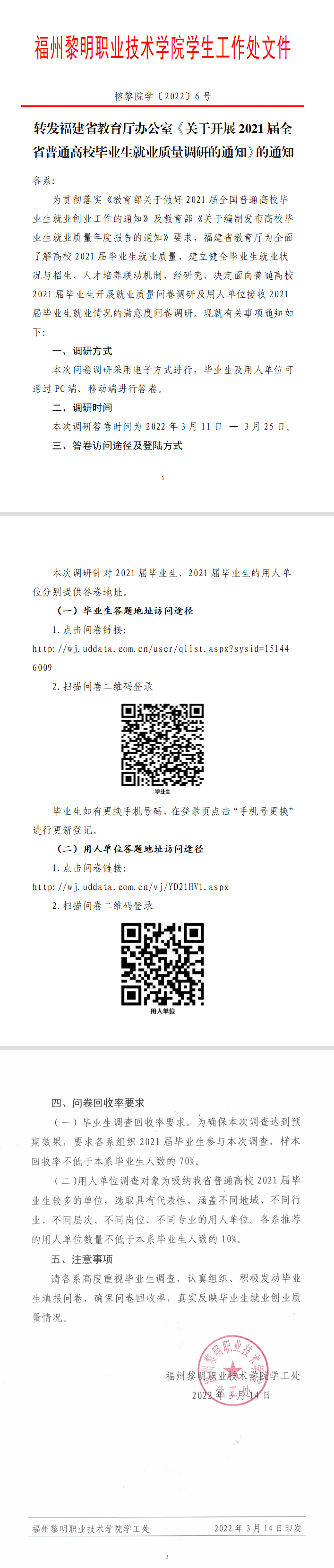 榕黎院学〔2022〕6号——转发福建省教育厅办公室《关于开展2021届全省普通高校毕业生就业质量调研的通知》的通知 - pdf
