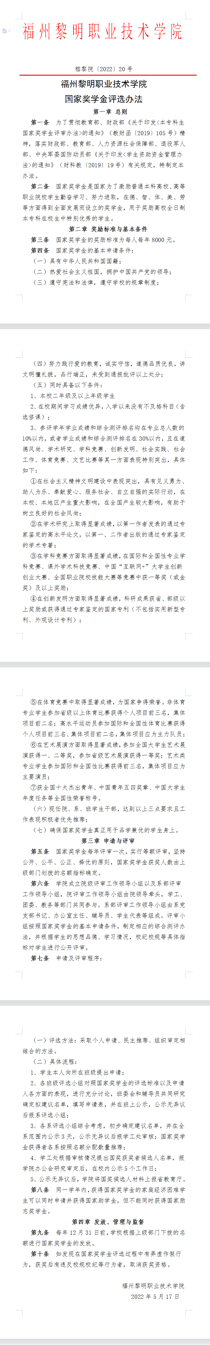 榕黎院〔2022〕20号——福州黎明职业技术学院国家奖学金评选办法