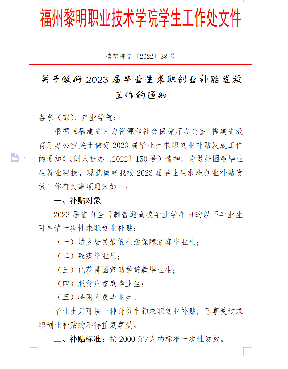 榕黎院学〔2022〕38号关于做好2023届毕业生求职创业补贴发放 工作的通知