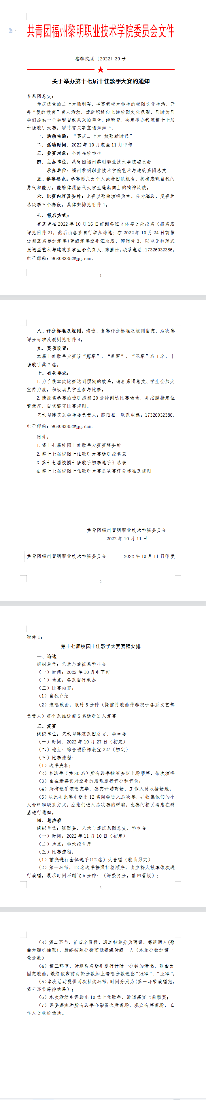 榕黎院团〔2022〕39号——关于举办第十七届校园十佳歌手大赛的通知