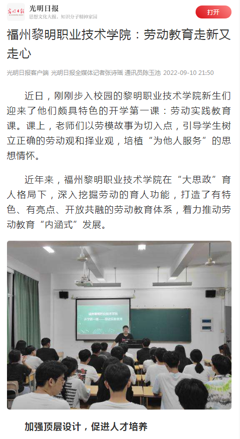 近年来,福州黎明职业技术学院在“大思政”育人格局下,深入挖掘劳动的育人功能,打造了有特色、有亮点、开放共融的劳动教育体系,着力推动劳动教育“内涵式”发展。