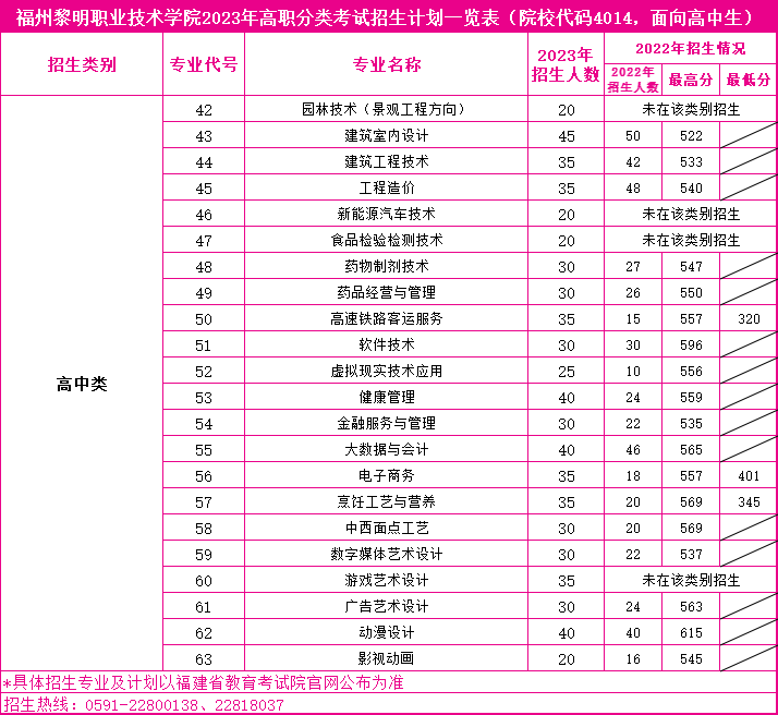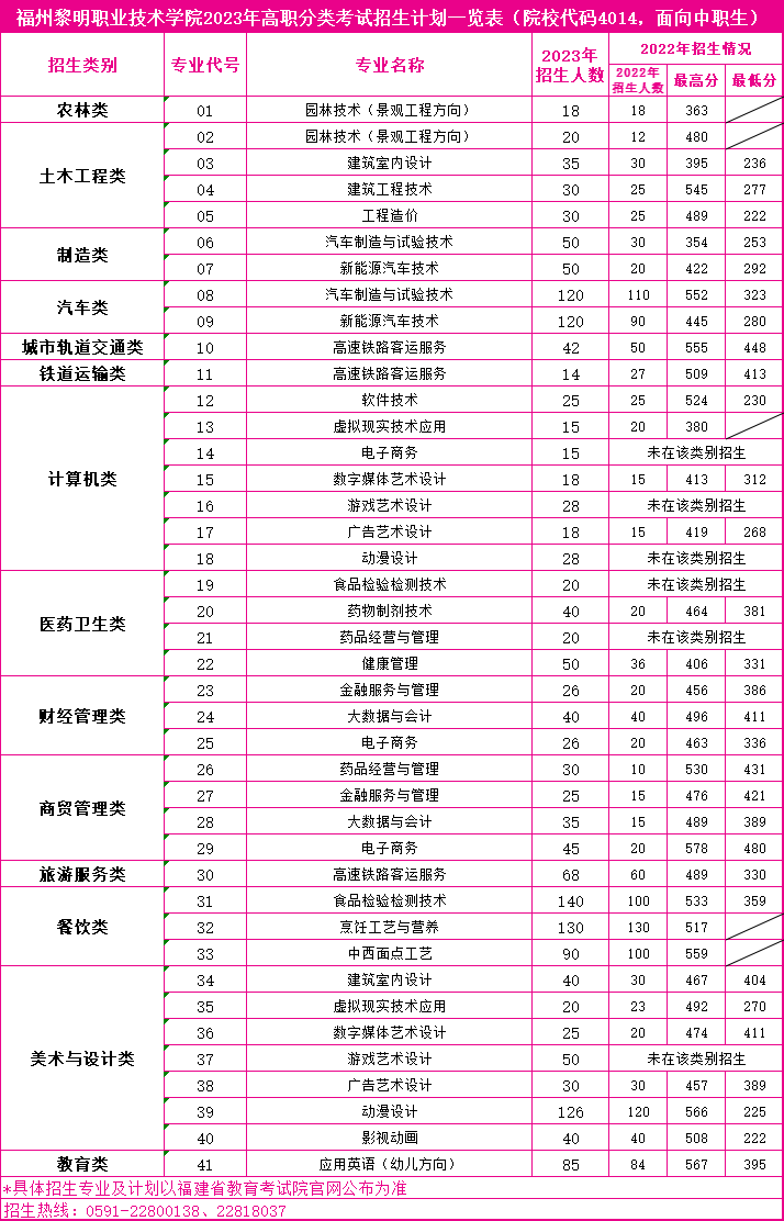 福州黎明职业技术学院2023年高职分类考试招生计划一览表
