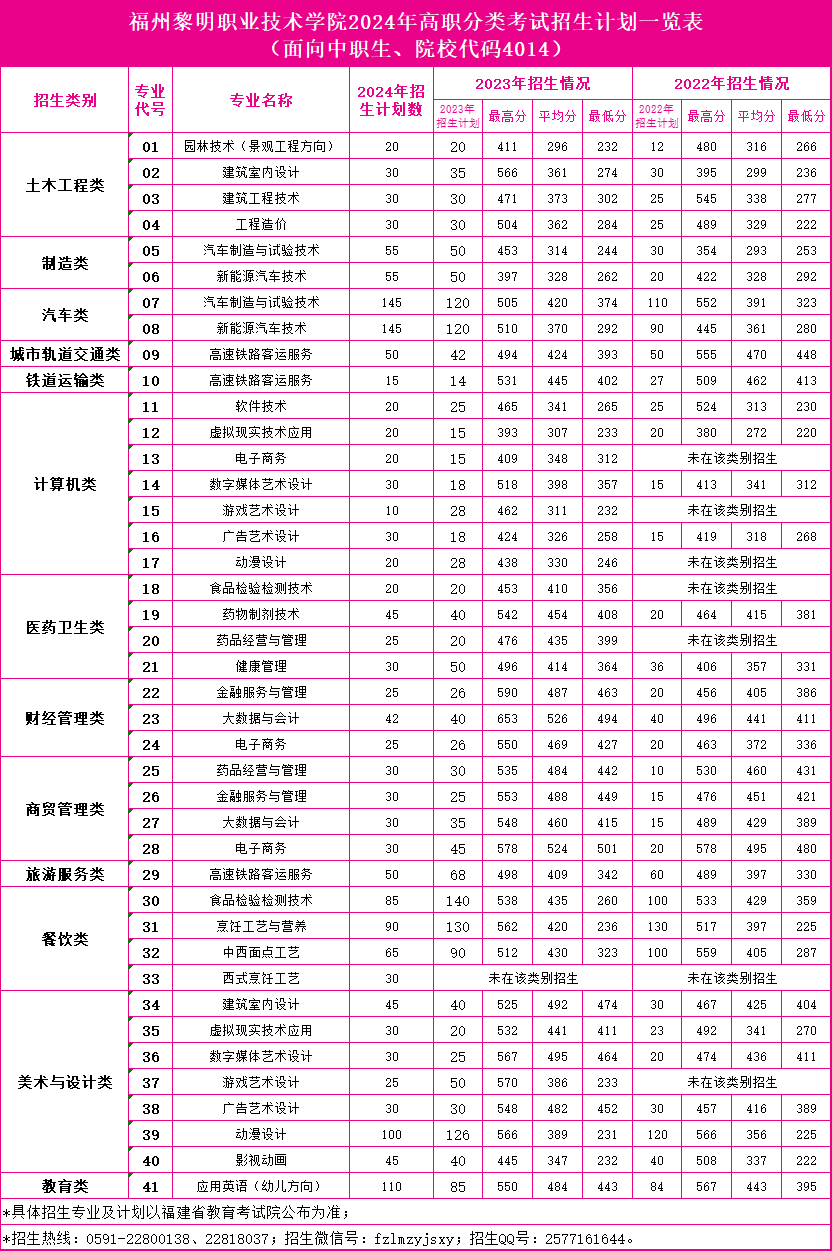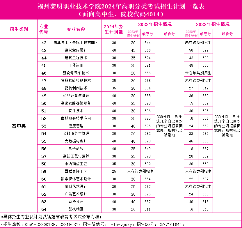福州黎明职业技术学院2024年高职分类考试招生计划一览表