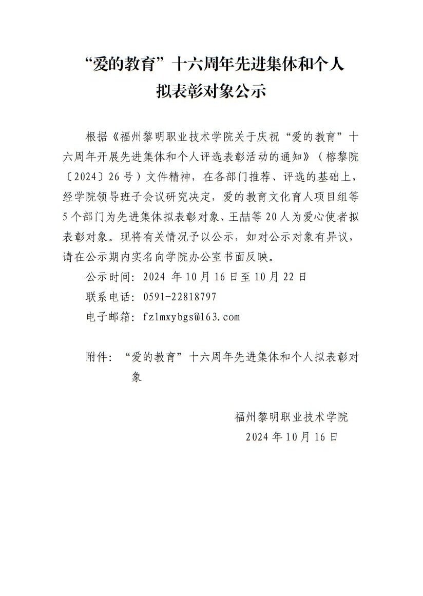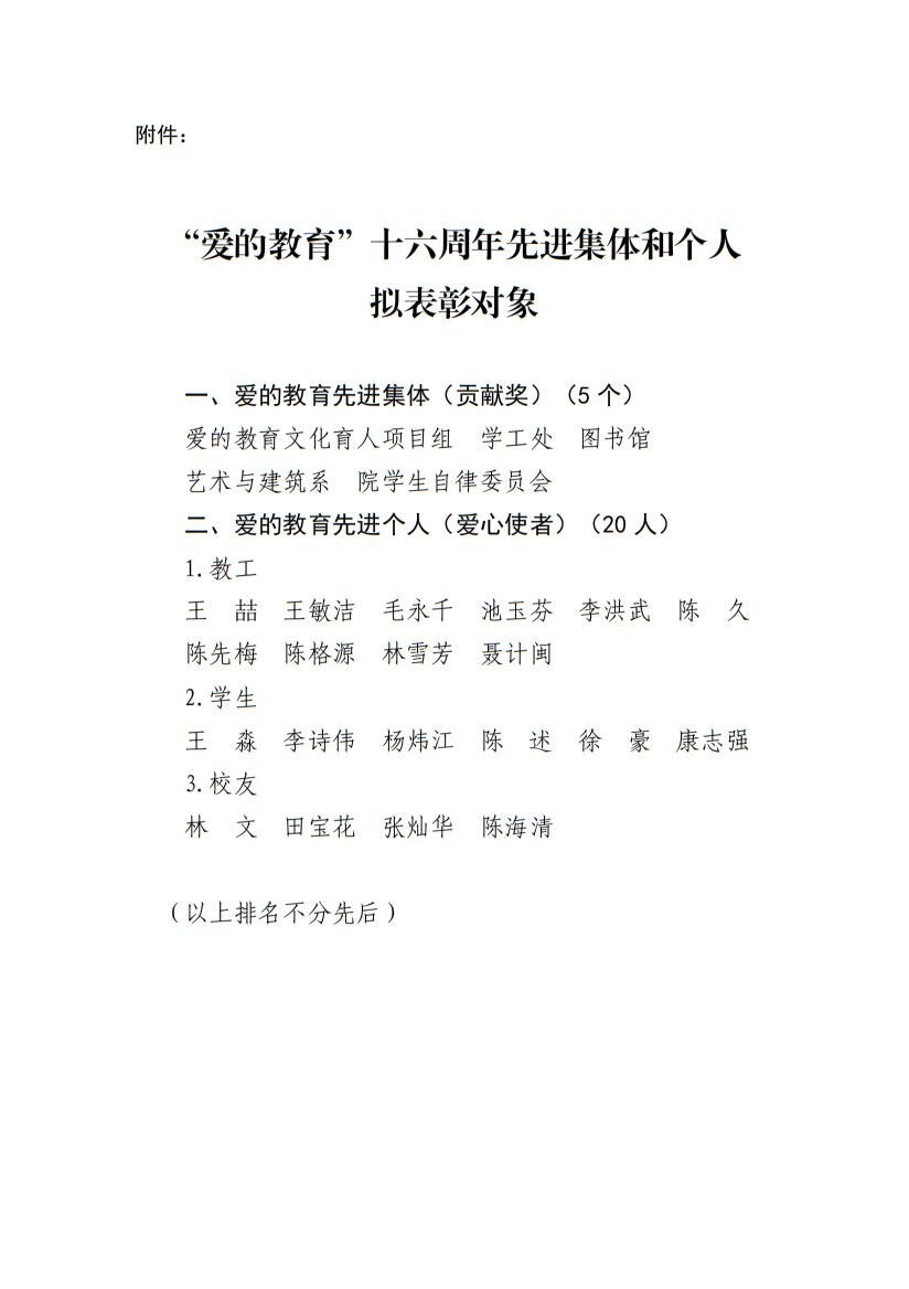 “爱的教育”十六周年先进集体和个人拟表彰对象公示