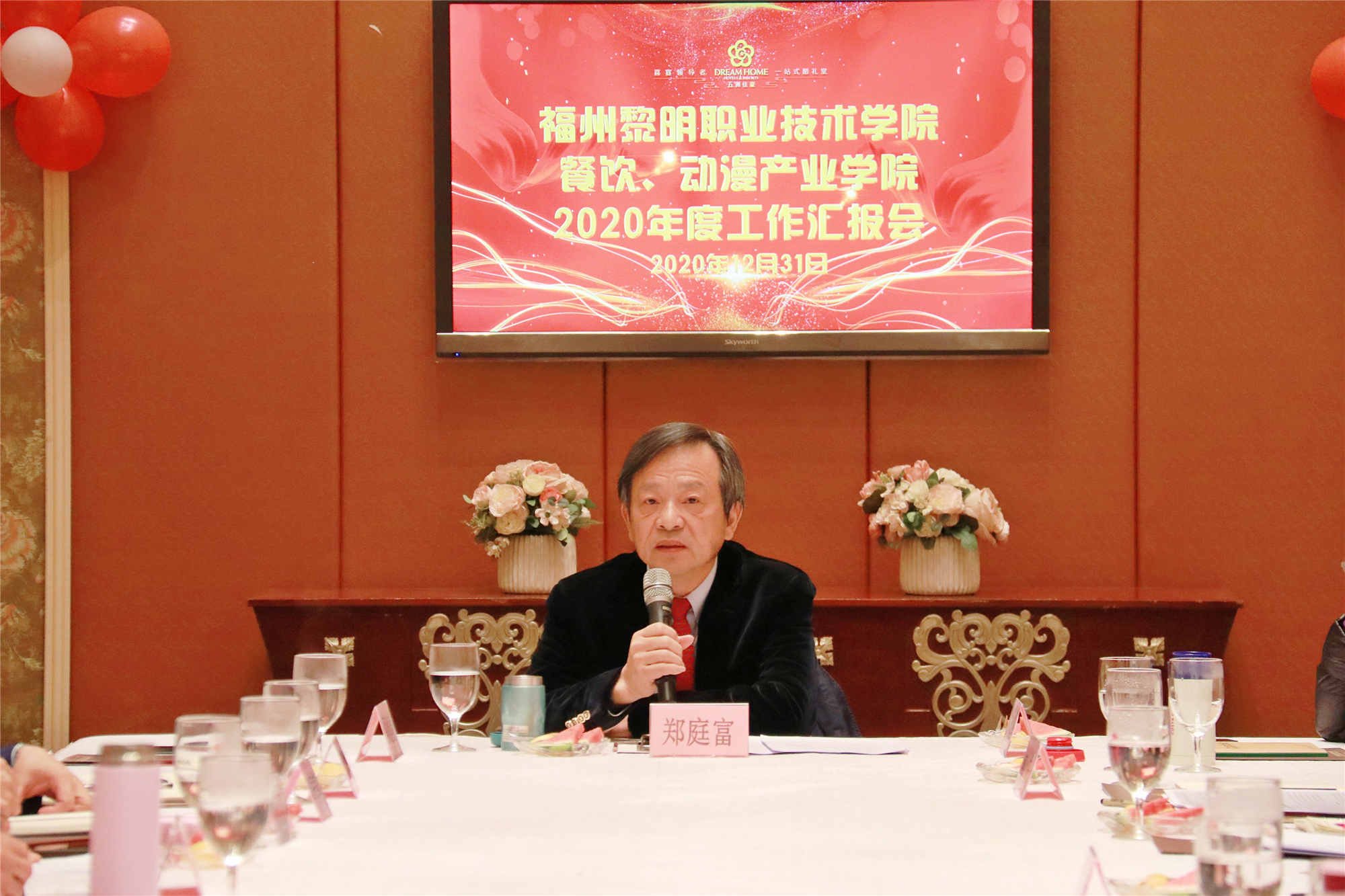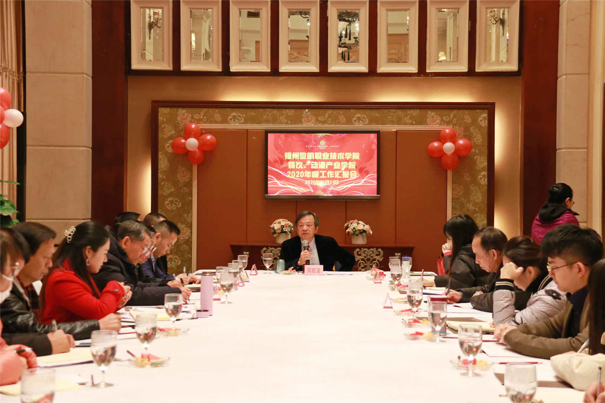 2020年12月31日上午,我院在五洲佳豪黎明酒楼凯旋厅召开产业学院工作总结汇报会,黎明集团董事局主席、黎明产业学院理事长郑庭富到会听取汇报并讲话,福州黎明学院董事长、产业学院院长王苏华主持会议,五洲佳豪酒店执行董事、黎明五洲餐饮产业学院常务副院长蔡健康,福州曼奇立德公司总经理、黎明曼奇立德动漫产业学院副院长郭庆,黎明学院领导魏洪、肖熙、刘思衡,产业学院相关理事陈阳、谢宇堂、薛伟强、赵雅晶、邱娇玲等,以及黎明学院院办、教务处、烹饪系、艺术系代表共20多人参加了会议。