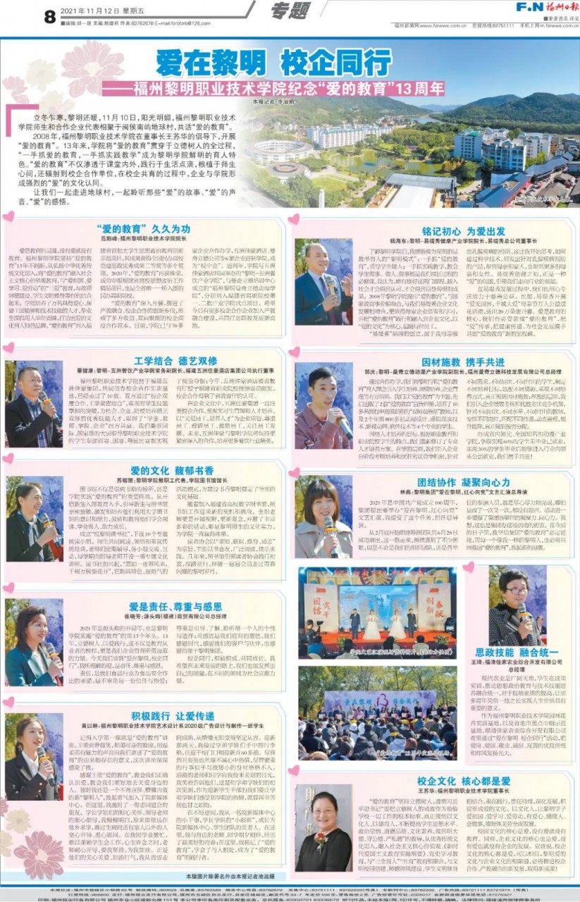 11月10日上午,福州黎明职业技术学院在学校露天广场草坪举行纪念“爱的教育”十三周年主题交流总结推进会议。会上,表彰了“爱的教育”先进集体和爱心使者,“爱的教育”征文比赛优秀论文、案例;产业学院企业董事长、总经理等在会上分享了“爱在黎明,校企同行”的实践探索与体会。