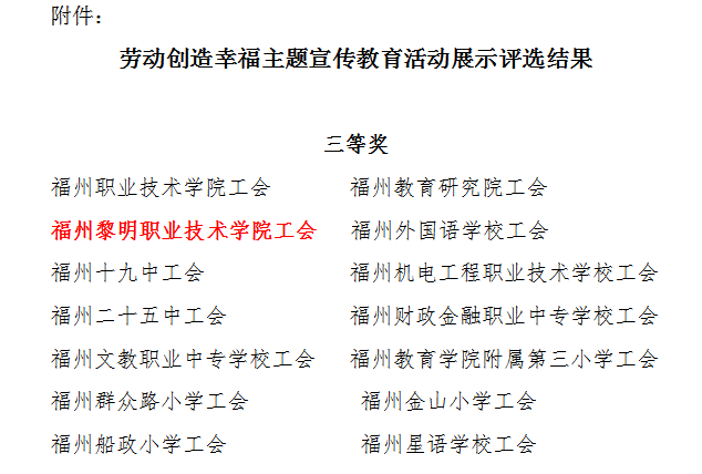 我院工会在福州市教育工会"劳动创造幸福”主题宣传教育活动展示评选中荣获三等奖!
