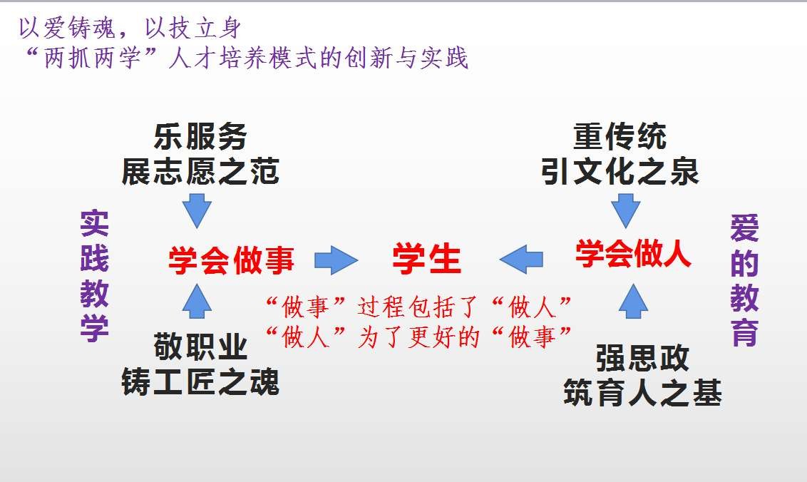 “两抓两学”是指一手抓爱的教育,以爱的教育启迪学生心灵,引导学生学会做人;一手抓实践教学,以实践教育培养学生的真才实干,教会学生学会做事。2011年起,该校接连将“爱的教育”写入学院章程、十四五发展规划、党委工作报告、人才培养方案,形成从“党建文件→学校规划→制度文件→实施细则”纵贯到底,培育“时代新人”的经线。