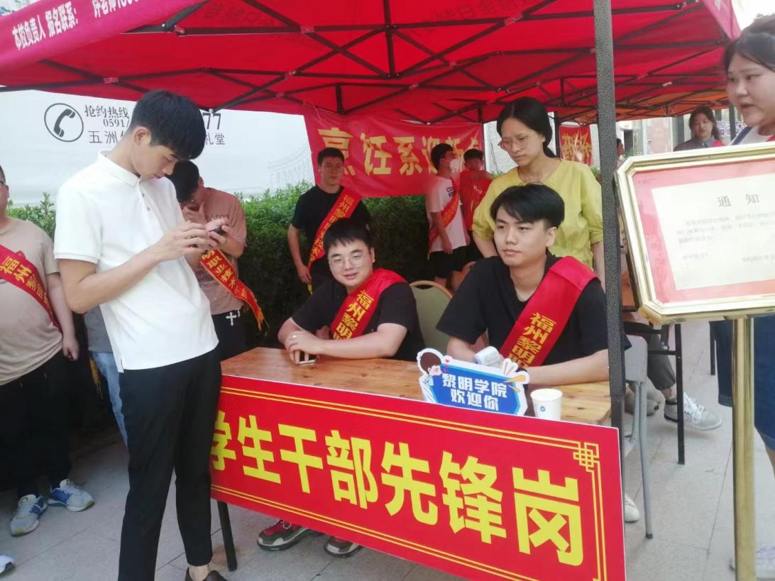 在福州火车站、汽车站设立的接待点上,志愿者们高举黎明学院标志牌等候新生的到来。大巴车上,志愿者为新生和家长讲解黎明学院“爱的教育”的校园文化,告知新生和家长报到流程,说明具体注意事项,耐心回答各种提问。让新生更好地了解黎明,做到方便新生顺利报到,节约报到时间,缓解路途中的枯燥乏味。党员团员志愿者们亮身份、做表率、树形象,充分展现黎明人用汗水浇灌收获,用实干笃定前行的精神风貌,用自身实际行动为迎新工作贡献力量。在商务系大本营前设立了入党申请书受理处,把党团教育放在报道的第一天,鼓励新同学们加强理论学习、实践锻炼、社会观察、志愿服务,努力成长为中国特色社会主义事业的合格建设者和可靠接班人。