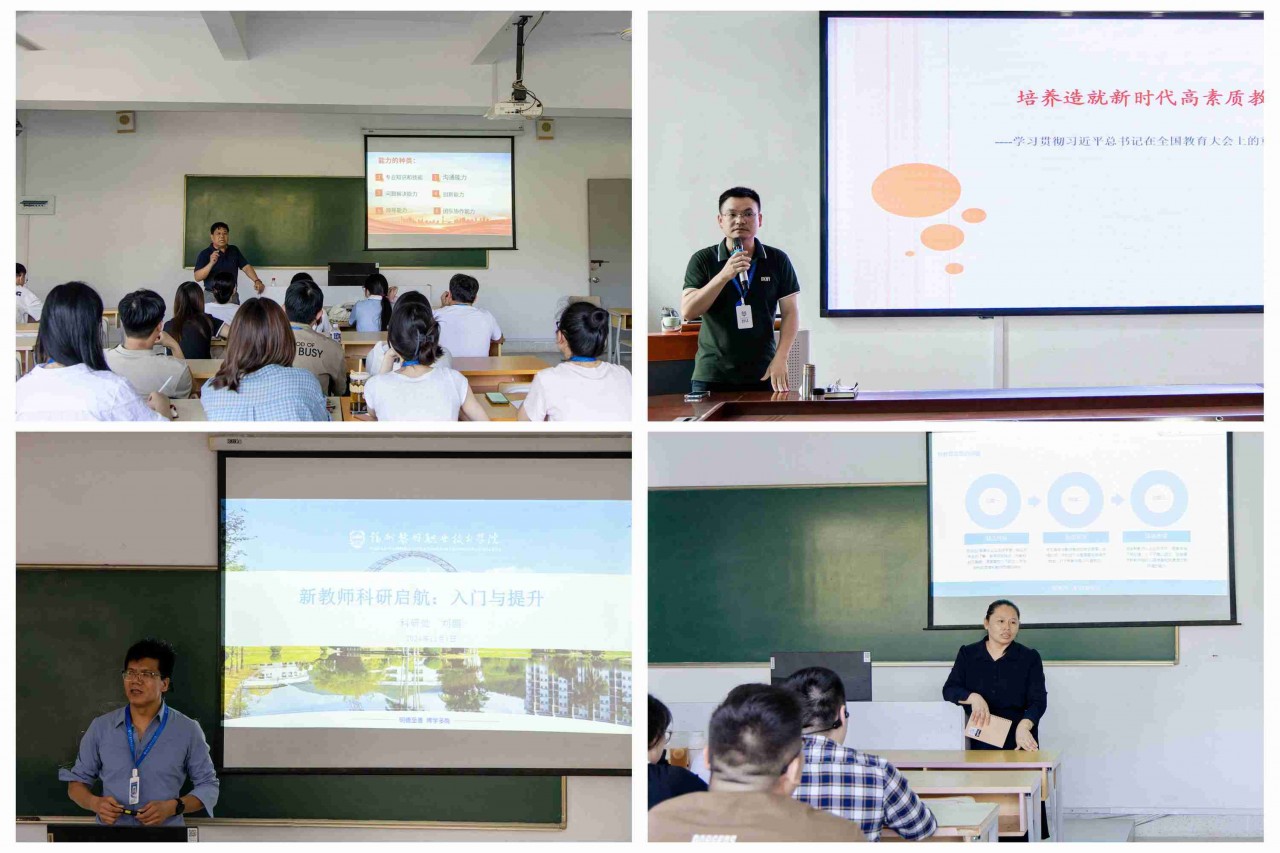 此外,本次培训还邀请了校内4位优秀教师对新教师开展了综合素质能力提升培训。马克思主义学院魏立娜教授以“培养造就新时代高素质教师队伍——学习贯彻习近平总书记在全国教育大会上的重要讲话精神”为题,结合教育家精神及其精神内涵,提出要做一名明大德、守公德、严私德的好老师。药学与健康管理系主任曾建雄副教授以“课程思政的育人与实践教学的教法”为题,结合学院“爱的教育”理念,深入剖析了课程思政的重要性和实施策略;并以“实践教学”人才培养观为出发点,来分享课程教学中具体的实践教法应用。艺术与建筑系主任赵雅晶副教授以“如何上好一堂课”为题,引领新教师深入剖析学情以奠定教学基石,鼓励教师不断创新教学方法,强化实践环节,让学生在“做中学、学中做”,真正掌握技能。电子商务专业教研室主任欧志亮副教授以“信息化教学能力提升”为题,从数字化教学入手,引导新教师充分认识数字化教学赋能高校教育教学改革,帮助新教师了解和认识数字化教学在拓展教学时空、共享优质资源、优化课程内容与教学过程、优化学生学习方式、精准开展教学评价等方面广泛应用,提高新教师通过数字化发现、分析和解决教育教学问题的能力,鼓励引导青年教师做推进数字化与教育教学深度融合教学改革创新的实践者。