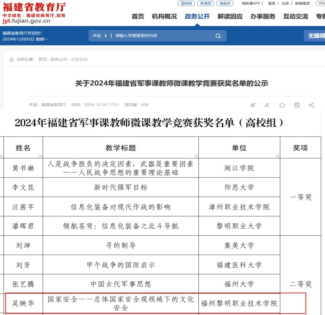 根据福建省教育厅《关于2024年福建省军事课教师微课教学竞赛获奖名单的公示》情况,我院教师吴映华的微课教学荣获高校组二等奖的好成绩。