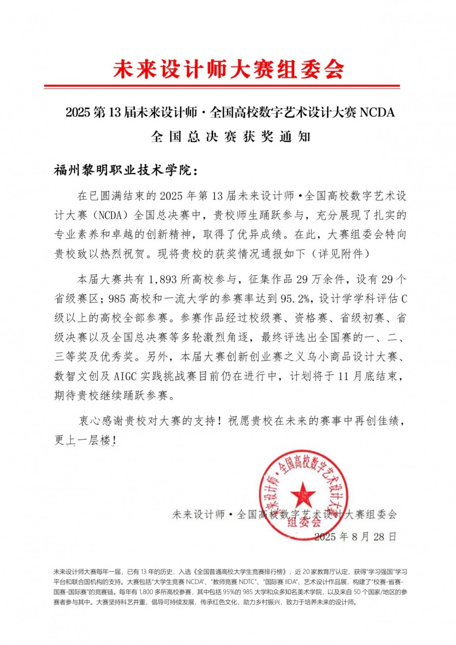 近日,2025年第13届未来设计师·全国高校数字艺术设计大赛国赛(NCDA)成绩揭晓。我院学生在激烈的竞争中脱颖而出,其中2023级数字媒体艺术设计3班的吴妍晰、苏莹、许少澎、许致博、吴友雄、李佳怡等6位同学的作品《葱香浮动》荣获二等奖(指导老师:柯阳昕、钱群),2023级广告艺术设计3班赖艺芸、陈国新、林志强、周玉梅等4位同学的作品《平和农产品系列包装》获得三等奖(指导老师:陈凤珍、廖春娥)。