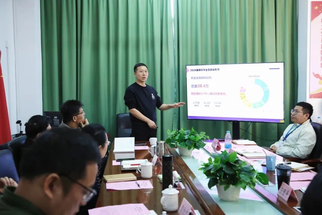 学工处副处长黄健结合参加“2025年福建省高校就业创业指导教师培训”的学习收获进行了专题分享。他基于培训中的前沿观点和行业洞察,分析了2026届高校毕业生就业面临的新形势与新挑战。同时,他对本年度大学生职业规划大赛的赛事方向与备赛要点进行了解读,提出了针对性的指导建议。
