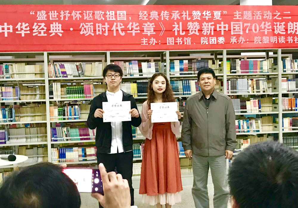 10月31日下午,图书馆与院团委共同主办的《读中华经典·颂时代华章》——礼赞新中国70华诞朗诵比赛决赛在图书馆第一书库举行。学院董事长王苏华、院长范超峰、副院长魏洪及部分系、处负责人和评委老师,学生代表共130余人到场观看。