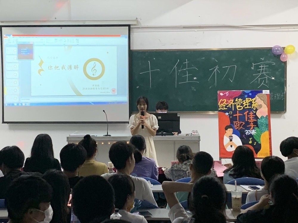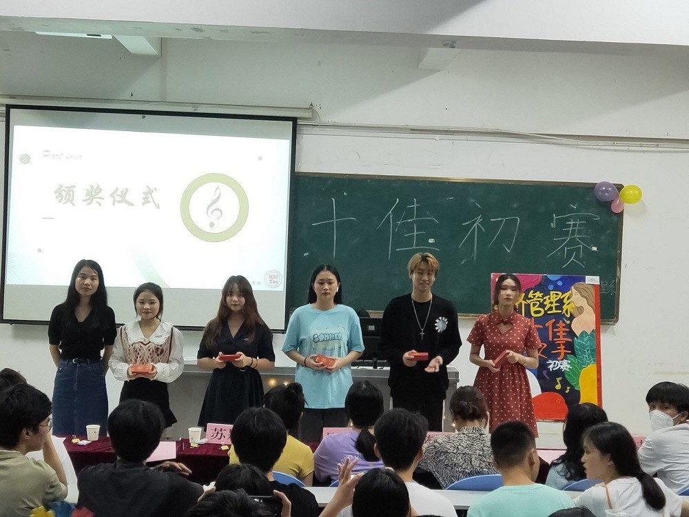 2021年10月14日于综合楼227教室举办了经济管理系十佳歌手初赛活动。为进一步弘扬校园文化生活,发展当代大学生综合素质及创新能力。本次活动由书记吴映华老师、副书记陈格源老师、赞助商新知教育许一香老师、辅导员潘炀钖老师、辅导员苏颖老师、院学生会主席王朝鳞学长、院学生会文艺部部长黄立志学长组成的评委团。