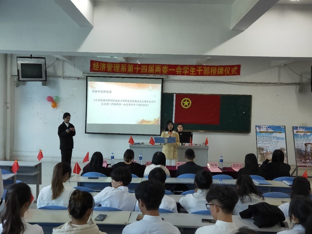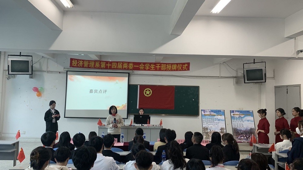 接下来由团总支学生副书记张开齐代表学生干部进行发言,表明职责与决心。活动最后由学工处聂计闽老师对本次经济管理系学生干部授牌仪式提出了认可与期许!为本次干部授牌仪式拉上帷幕。