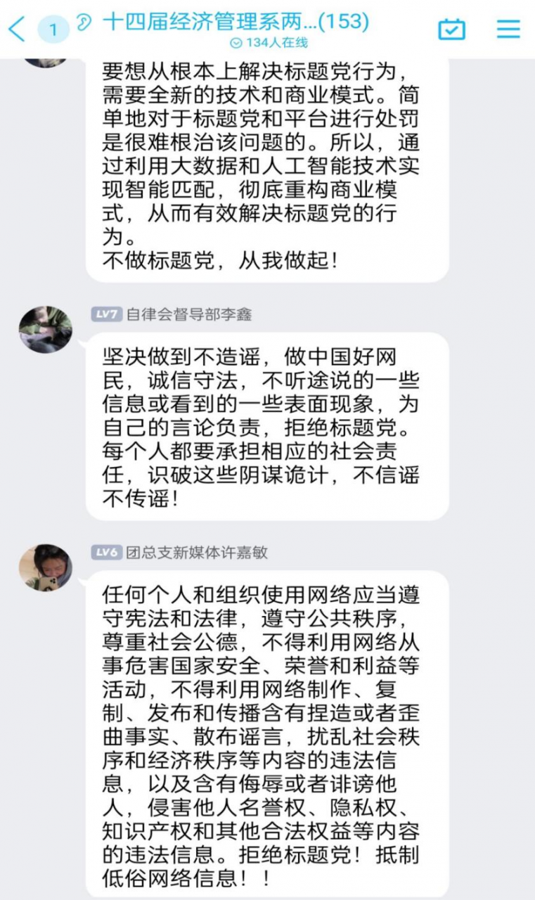 通过观看这些视频后,大家越发的觉得作为一名大学生,更应该加强自我学习,增强辨别谣言、抵制谣言的能力。不可否认,网络在给予社会娱乐的同时传递了许多催人奋进的正能量。可却有许多人,利用网络强大的传播能力从中牟利。网络的底线,不应如此。因此,我们应做到文明上网,自觉远离网络谣言,谨慎评论网络热点事件,严禁扩散存储暴恐音视频。坚决做网络健康环境的维护者。