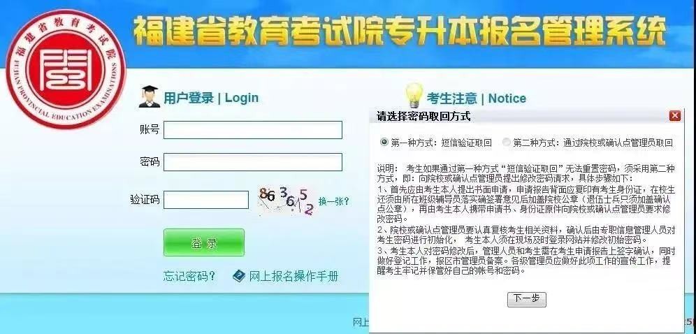 (备注:密码的取回方式有两种,短信验证取回、通过院校管理员取回)