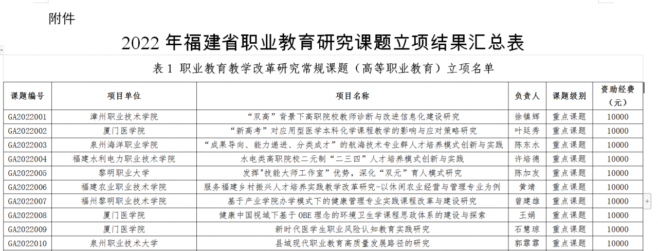 日前, 福建省职业技术教育中心公布了2022年福建省职业教育研究课题立项结果,我院曾建雄副教授《基于产业学院办学模式下的健康管理专业实践课程改革与建设研究》被认定为2022年福建省职业教育研究重点课题。