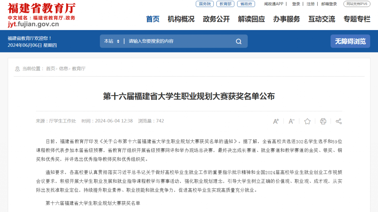 近日,福建省教育厅印发《关于公布第十六届福建省大学生职业规划大赛获奖名单的通知》,我院郑金忠同学获成长赛道职教组铜奖(指导老师:郑爱清、林梦超)、林崇炤获就业赛道职教组铜奖(指导老师:毛永千)。