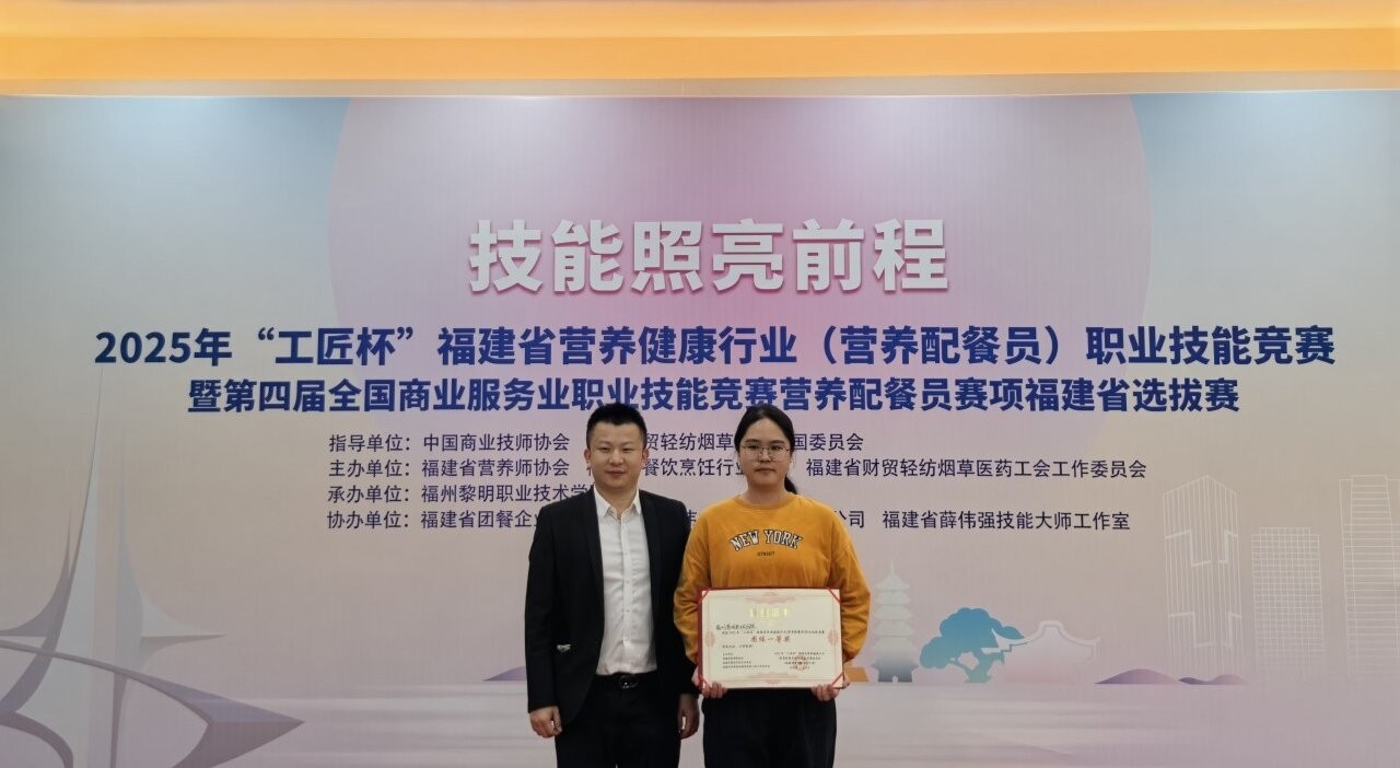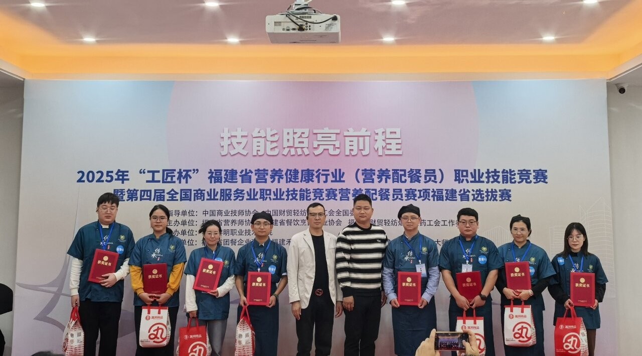 2025年11月22日-23日,中国商业技师协会、中国就业培训技术指导中心、中国财贸轻纺烟草工会全国委员会指导,福建省营养师协会、福建省财贸轻纺烟草医药工会工作委员会主办的2025年“工匠杯”福建省营养健康行业(营养配餐员)职业技能竞赛在福州黎明职业技术学院举办。我系选派吴丽珍、张雨彤、吴艺军三名选手凭借扎实功底与创新理念脱颖而出,以总分第一斩获团体一等奖。