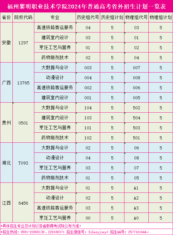 福州黎明职业技术学院2024年普通高考省外招生计划一览表