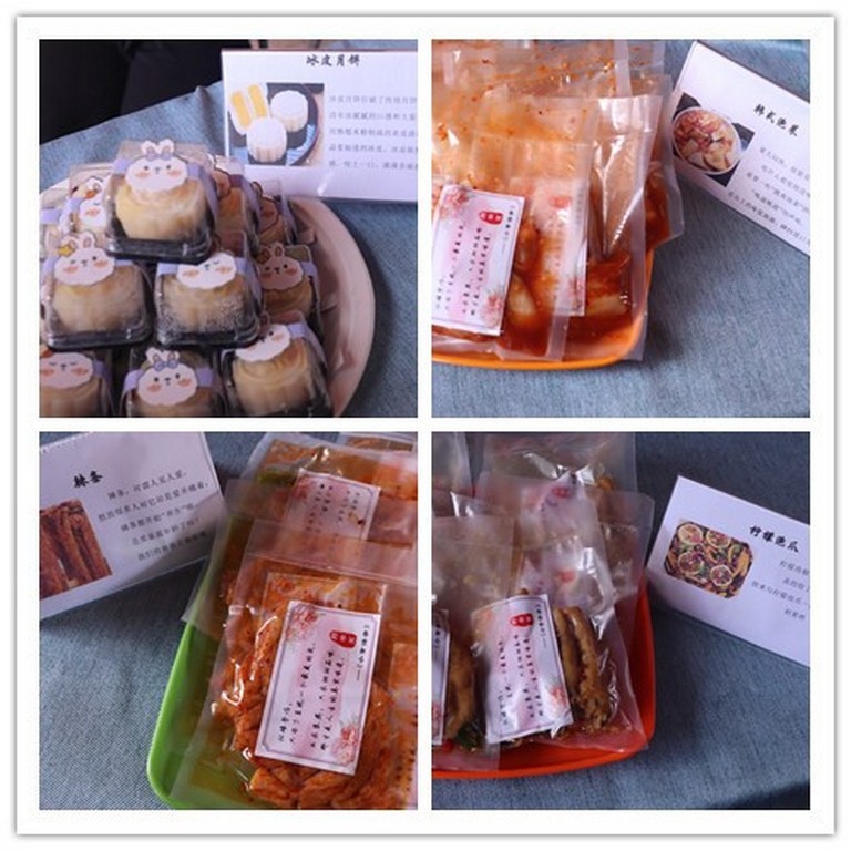 在展示活动现场,有与夏天绝配的柠檬泡椒鸡爪CP,有“呱滋呱滋”声响的脆爽韩式泡菜,有打破传统月饼标准的奶黄馅冰皮月饼,还有人见人爱、充满儿时回忆的辣条;展品充分体现了食品专业的特色,从食品工艺学、食品保藏技术以及食品营养学等专业角度融入到日常食品中。