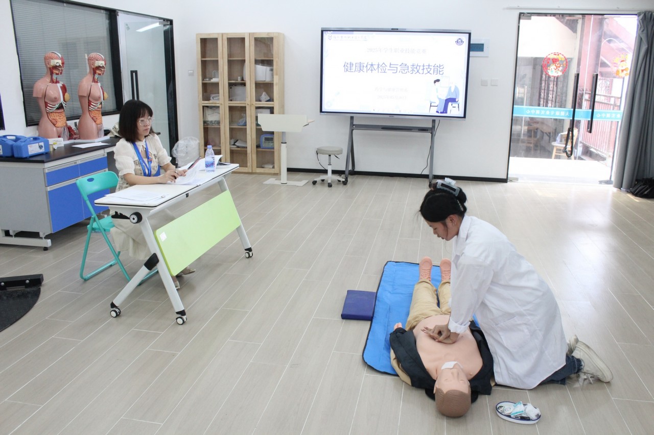 为提升学生健康意识与应急救护能力,药学与健康管理系于2025年5月16日在大健康实训室举办“健康体检与急救技能”竞赛。本次竞赛聚焦“健康中国2030”战略需求,设置BMI值测算、血压测量、心肺复苏(CPR)3项实操考核,共吸引全系30名选手同台竞技。-fOq7i.jpg)