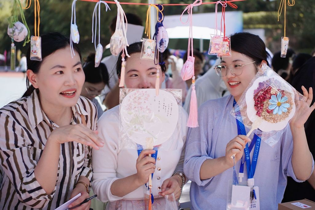 在中药团扇项目中,指导老师林丹和张云燕带领健康管理专业学生在扇子上用笔勾勒出如爱心、蝴蝶等图案,在注重材料合理应用和香味协调性的前提下,再用桂花、薰衣草等新鲜中药材填充。最终中药团扇项目获得第一名佳绩,获奖的同学分别有李硕、张家诚、郭嘉静、陈虹。
