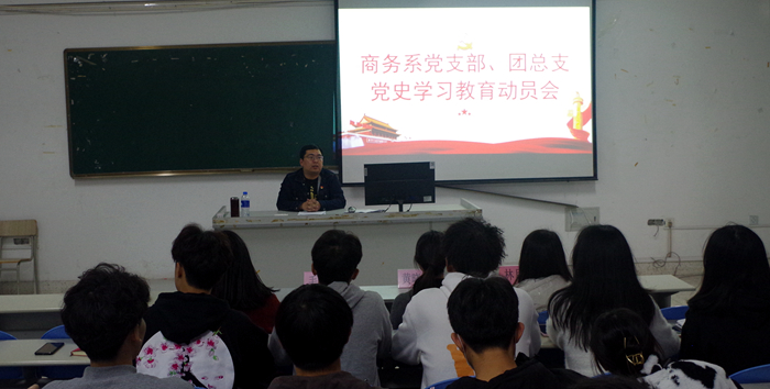 毛永千指出,要深入学习、认真理解、努力践行大会精神,并就如何开展好党史学习教育提出要求:坚持正确导向,要把党史学习教育作为增强政治性、先进性、群众性的一次政治淬炼;商务系党支部、各班团支部要加强组织领导,要加强对面向青年学生的学习教育的统一领导;注重分层分类,区分不同同学的认知特点和学习习惯,把分层分类作为推动工作的基本方法;做好宣传报道,将党史学习教育作为统领全年支部党建工作及团总支宣传思想工作的主题,确保学习教育活动的实效性。各级学生干部要以高度的政治责任感和强烈的历史使命感全身心投入到主题教育学习中,统筹安排学习和工作,务必高标准高质量完成学习教育各项任务,为全系广大青年学生带好头、作表率。引导广大青年学生深刻领会党史学习教育的目标要求,用习近平新时代中国特色社会主义思想武装头脑、指导实践、推动工作,提高青年学生干部的政治判断力、政治领悟力、政治执行力,引导全系青年学生学史明理、学史增信、学史崇德、学史力行;要创新主题教育学习方式,结合青年大学生的特点,提高策划活动的水平、增强制作作品的能力,打造出一批主题鲜明,积极向上,寓教于乐,人人参与的高质量精品活动。