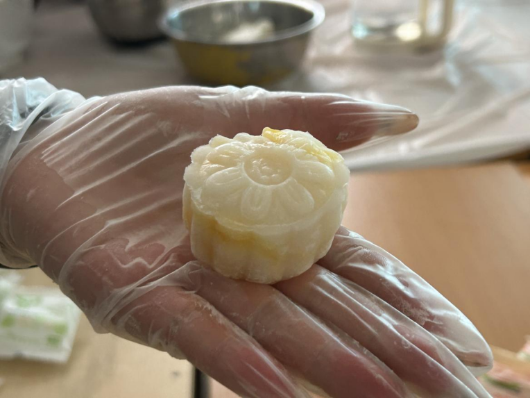 活动开始大家戴好一次性手套,揉制冰皮、包裹馅料、按压模具。经过一番制作,一个个造型精致、纹路清晰的冰皮月饼新鲜出炉,大家还给自己的作品命名,赋予其独特的节日寓意。