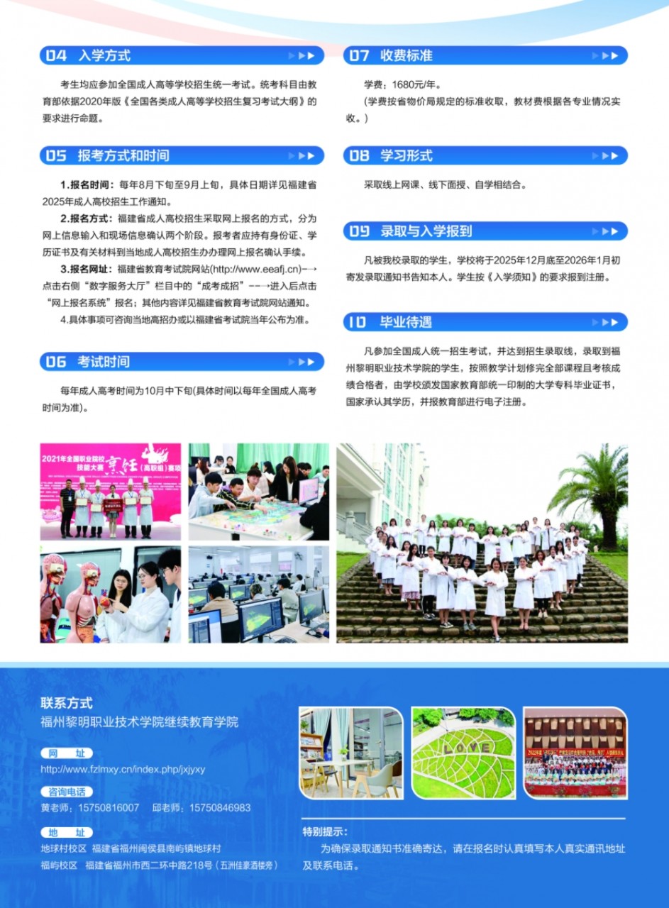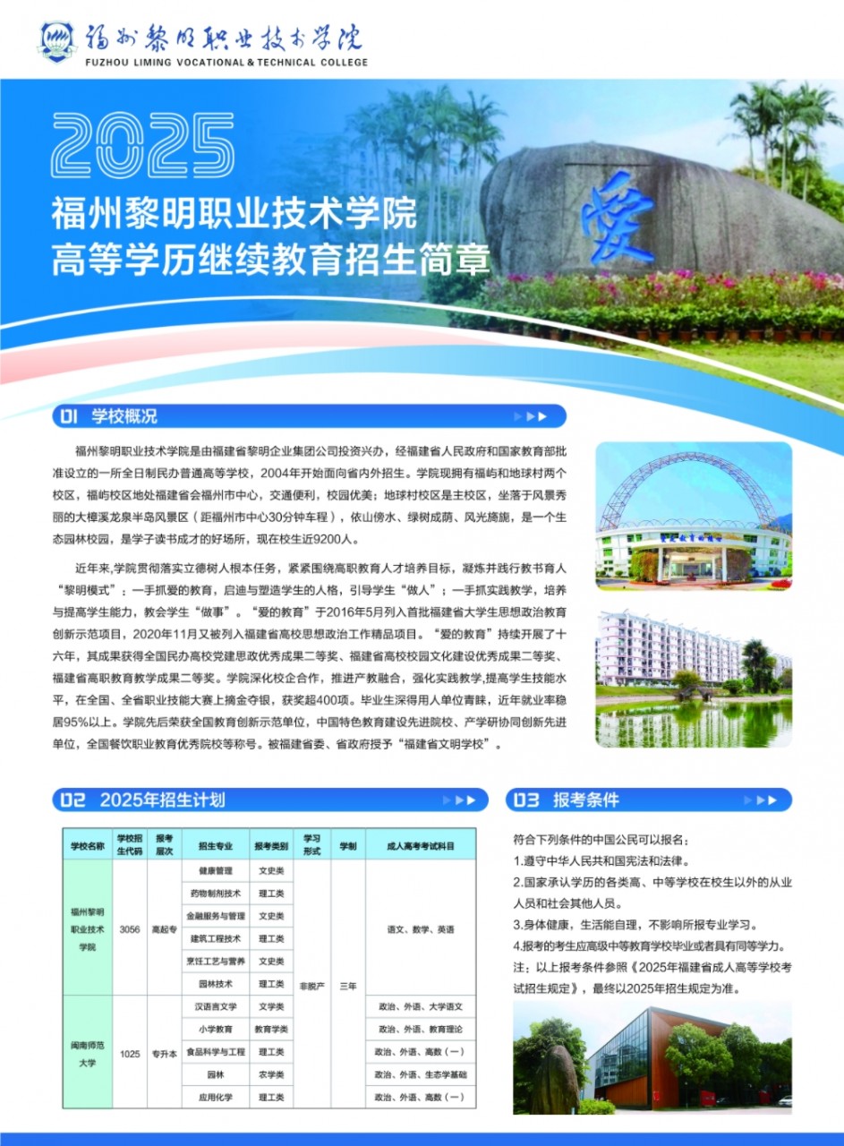 2025年福州黎明职业技术学院高等学历继续教育招生简章