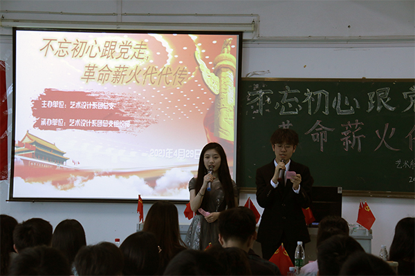 为迎接中国共产党诞生100周年,教育引导学子们坚定理想信念,矢志跟党奋斗。提升民族自信心弘扬社会主义爱国情怀,以及提高团员对党相关知识的了解。4月29日下午3点由艺术设计系团总支主办的“不忘初心跟党走,革命薪火代代传”主题团课成果展在综合楼327教室成功举行。本次团课的到场嘉宾有:学院党委副书记王新华老师、艺术设计系党支部书记林鸿燕老师、艺术设计系团总支副书记李彬垠老师、艺术设计系各位辅导员以及艺术系的同学们。