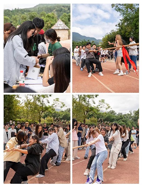 本次活动以拔河项目为主,再配以两三项小团队活动。在拔河项目中,比赛以班级为单位,抽签分组决定比赛顺序,两两竞争,实行淘汰制晋级方式。比赛中同学们互相鼓励,一起体验成功的喜悦,一张张笑脸更显得青春洋溢,活力四射。在其他五六人为单位的小项目中,同学们也积极参加,玩得不亦说乎。