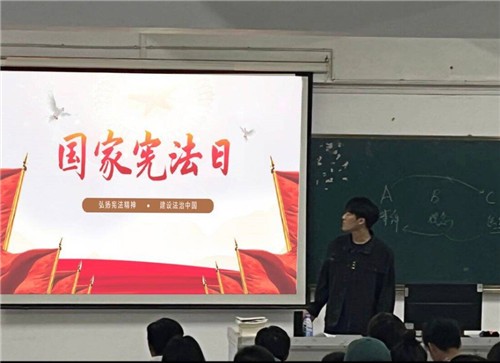 此次活动分为宪法宣传主题班会、宪法晨读、宪法视频学习三个部分。12月3日晚上,我系各专业辅导员在宪法宣传主题班会上,就宪法的诞生、宪法完善历程以及在国家生活中的重大意义向同学们进行了宣讲。12月4日早上,各班团支书利用早读时间带领同学们进行了宪法晨读,同时通过观看学习宪法小视频,让同学们了解了什么是宪法、宪法的地位、宪法形成的意义等相关知识,另外新生军训班级也组织了同学们在宿舍观看全国青少年普法直播。