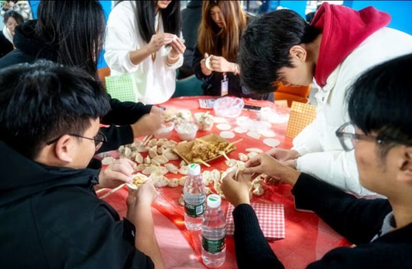 本次活动由我系自律会承办,党支部书记林鸿燕老师、各专业辅导员以及百余名学生参加。活动前,志愿者将提前准备好的面粉、饺子馅、饺子皮等原材料摆放在餐桌上,等待老师和同学们的到来。活动过程中老师和同学们一起动手包饺子,比拼速度、比拼最美饺子,现场气氛热烈,大家互聊家常,你来我往,其乐融融。在一片欢声笑语中,同学们通过亲身体验节俗活动感受到中华传统文化的厚重底蕴。在等待饺子出锅的过程中,还开展了猜歌、唱歌等活动。最后,为了感恩学院后勤工作人员日常的工作付出,我系团总支青年志愿者分头行动,将煮好的饺子打包送至食堂阿姨、保安手中,对他们送上节日的祝福。