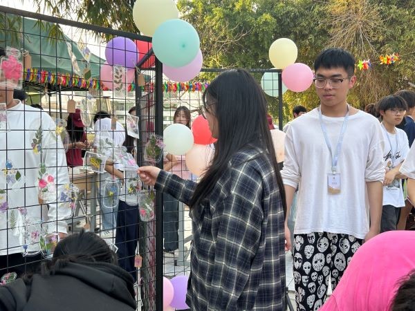 活动在入口处设置了创意签到区,参加活动同学们会选择自己认为有意思的叶子夹到铁架上,“生命之树”在同学们的手下绽放。