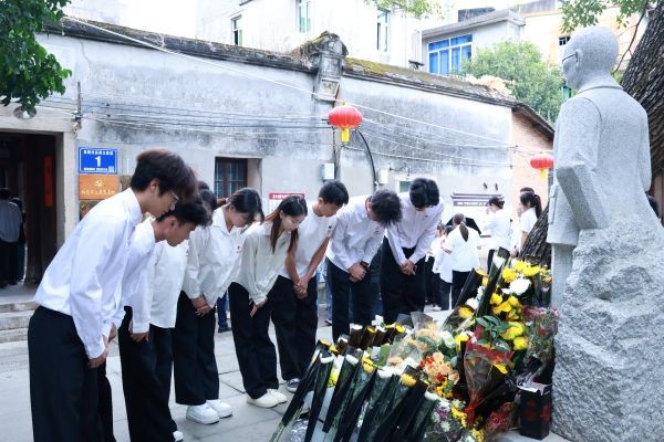 师生一行实地探访吴石故居,大家手捧素菊,缓步走向吴石将军雕像,郑重敬献鲜花。全体人员肃立雕像前,躬身行礼、静默致哀,片刻寂静中,将军眉宇间的坚毅仿佛穿透岁月,让在场者深切体悟到隐蔽战线工作者的崇高气节,也让“忠诚”二字在静默中愈发厚重。
