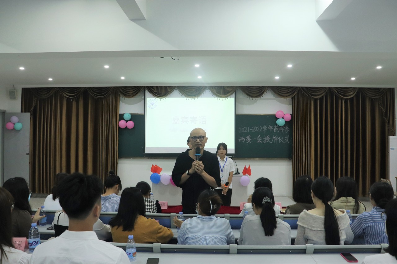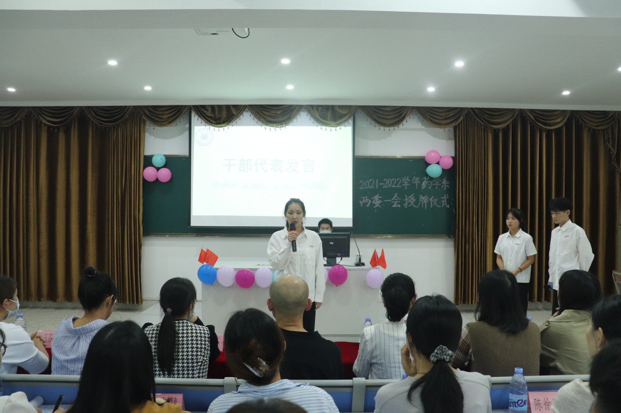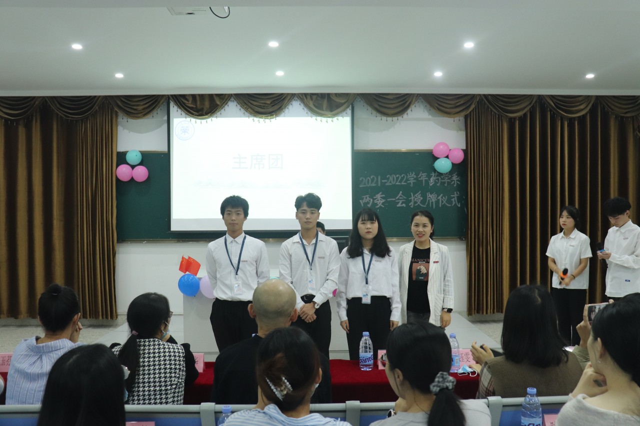 2021年10月19日下午两点三十分在阶梯二教室举行药学系“两委一会”新干部、新干事授牌仪式,此次到场的嘉宾有药学系主任曾建雄老师、药学系党支部书记郑爱清老师、辅导员胡钰雯、鲍佳佳老师、各班级班主任及药学系“两委一会”全体成员。以团歌《光荣啊,中国共青团》唱响此次会议的开始。