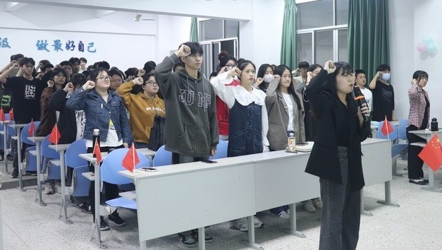 主题影片播放结束后,由药学系团总支学生副书记曾琳婷上台带领全体成员一起重温入团誓词。未来属于青年,希望寄于青年,中华民族伟大复兴的中国梦终将在一代代青年人的接力奋斗中变为现实。作为新时代的青年当立大志、明大德、成大才、担大任,以聪明才智贡献国家。