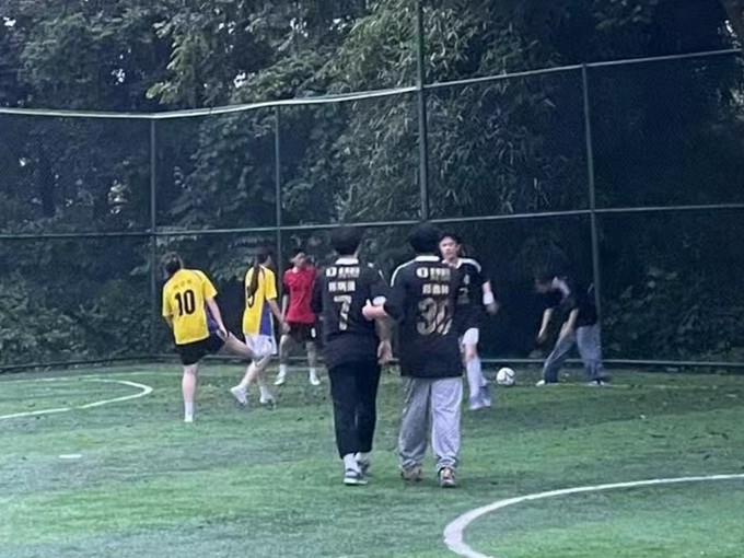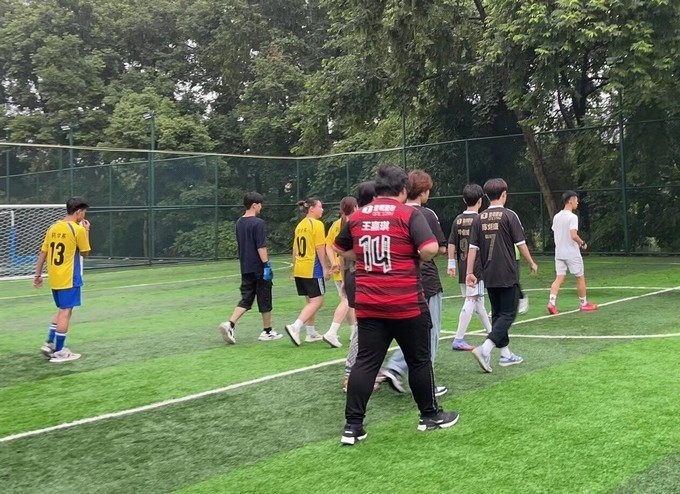 比赛还未开始,双方运动员们个个精力充沛、蓄势待发。随着哨声响起,比赛正式开始,曼奇立德运动员就发起了猛烈进攻,多次将球传到我方球门附近,造成了很大的威胁,并且两度将球踢成一道完美的弧线射入球门右上角。我系运动员虽然极力调整心态、全力配合想要挽回比赛局面,但由于刚开始比分悬殊,最终以4:6的比分暂时落后于对方,结束上半场。